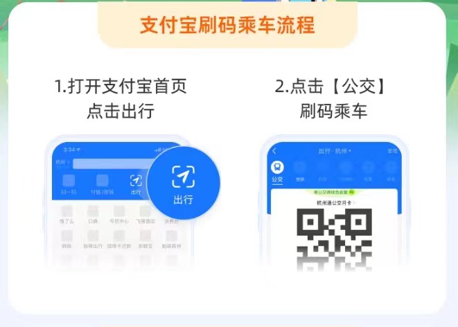 乘坐公交:點擊支付寶首頁出行,已開通公交乘車卡的用戶可直接刷碼乘車。未開卡用戶開卡后即可刷碼乘車,乘車完成后自動抵扣。