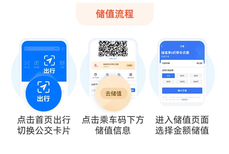 5.如何使用公交儲(chǔ)值優(yōu)惠券:已領(lǐng)券用戶點(diǎn)擊支付寶首頁-出行,已開卡用戶可點(diǎn)擊乘車碼下方儲(chǔ)值按鈕,進(jìn)入儲(chǔ)值頁面,儲(chǔ)值金額大于或等于50元,即可享受儲(chǔ)值立減優(yōu)惠。