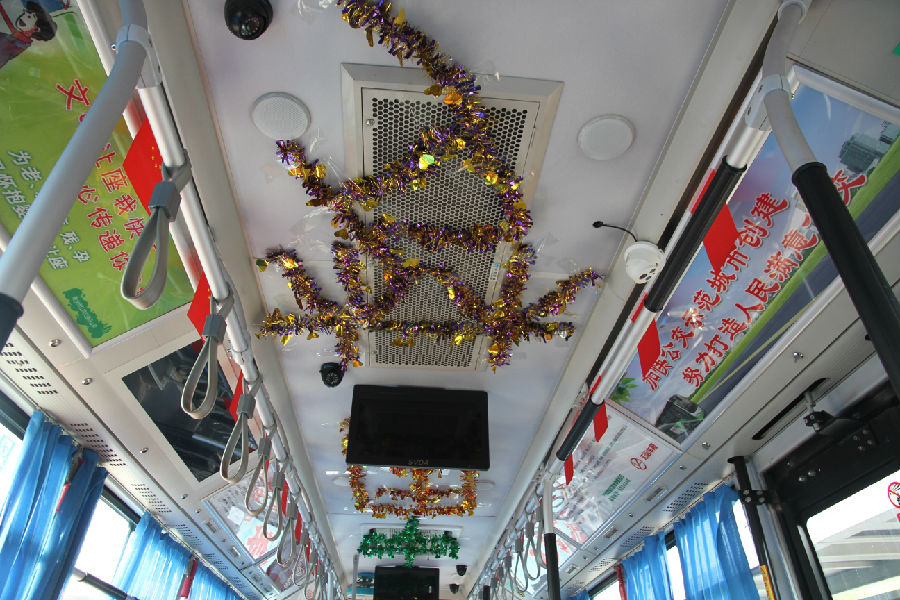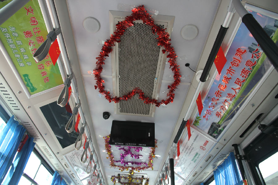 記者看到,國慶主題公交車的外觀與普通公交車無異,但進入車廂就發(fā)現(xiàn),在車廂頂部,兩邊各懸掛著整齊、鮮艷的國旗,有的在頂部還裝飾有“歡度國慶”“中國萬歲”等醒目標語和“中國心”圖案。同時市公交總公司每名司機的右臂上還戴了一枚國旗貼。這一裝扮令人耳目一新的同時,也讓人感受到濃濃的國慶氣氛。一位乘客說:“今年是新中國成立70周年,一上車就看到車廂內(nèi)有這么多國慶元素,心里很激動,我為祖國而自豪”。不少乘客更是拿出手機拍照留念。司機和乘客共同處在這樣的氛圍中,濃濃的愛國情懷在每個人心中涌動。