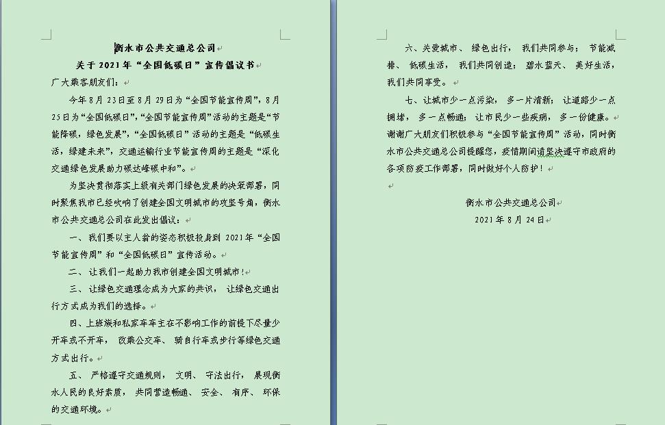低碳出行倡議活動(dòng)?偣疽8月23日至29日“全國(guó)節(jié)能宣傳周”為契機(jī),在公司內(nèi)部開(kāi)展少用一張紙、節(jié)約一度電、做好垃圾分類等活動(dòng),并利用“衡水公交微信公眾號(hào)”向社會(huì)發(fā)出“衡水市公共交通總公司關(guān)于2021年全國(guó)低碳日宣傳倡議書”。