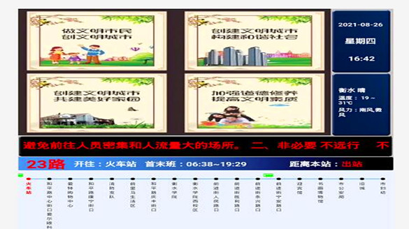 公益廣告提升活動(dòng)。近日,總公司對(duì)公交關(guān)于廣告宣傳內(nèi)容進(jìn)行了全方位整改提升,截至8月27日,公交站亭更換公益廣告73塊,共建小區(qū)更換公益廣告2塊,210余部公交運(yùn)營(yíng)車輛車載節(jié)站屏更新公益廣告內(nèi)容,450部運(yùn)營(yíng)車輛安裝文明禮讓宣傳展板,火車站10座電子站牌全部更新公益廣告內(nèi)容。