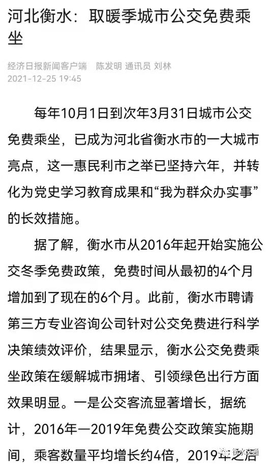 ◆◆《經(jīng)濟(jì)日?qǐng)?bào)》發(fā)表了題為《河北衡水:取暖季城市公交免費(fèi)乘坐》的文章,文章從績(jī)效評(píng)價(jià)角度進(jìn)行分析,認(rèn)為衡水公交免費(fèi)政策對(duì)衡水市空氣質(zhì)量不斷提升發(fā)揮了積極作用,是政府將改革紅利轉(zhuǎn)化為黨史學(xué)習(xí)教育成果和“我為群眾辦實(shí)事”的長(zhǎng)效措施。