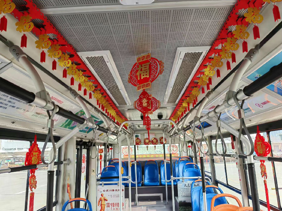 原來這些喜慶的設施都是18路的車長利用晚上收車后時間裝扮的。通過扮靚車廂,濃厚“年味”,為乘客提供更加溫馨的乘車環(huán)境。